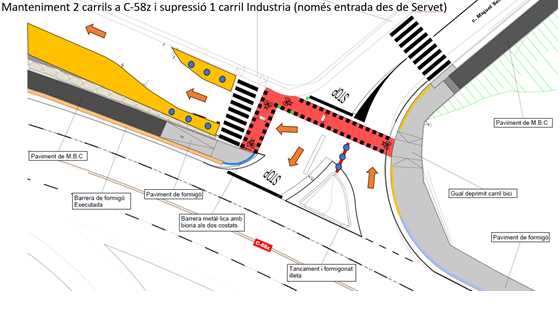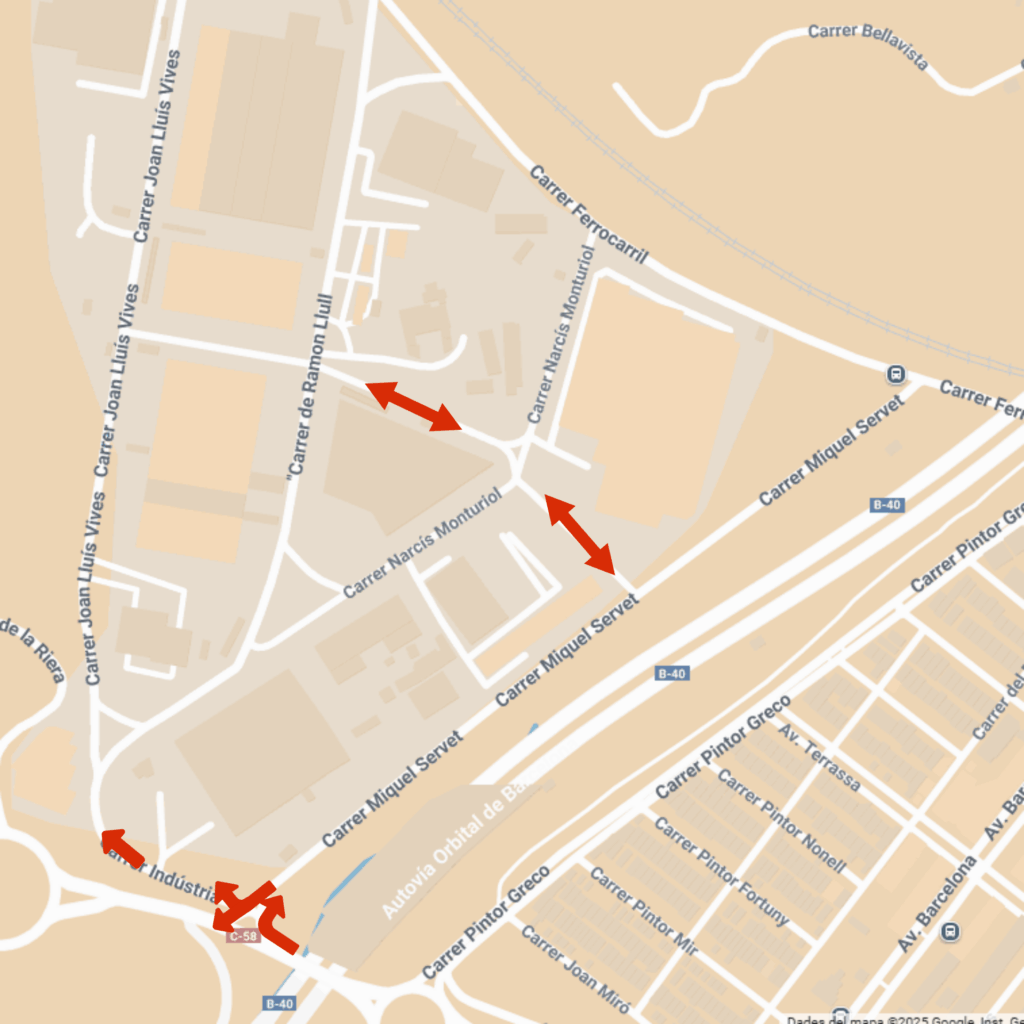 - El carrer Indústria passa a ser d’un sol sentit, d’entrada al polígon, i s’hi accedeix només des del carrer Miquel Servet. L’accés directe des de la C-58z queda prohibit per tal de pacificar el trànsit i reduir la velocitat dels vehicles en aquesta cruïlla, compartida entre vianants, ciclistes i vehicles.